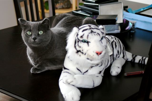 Anyway, the point is when we walked into the kitchen, I saw Scarlet had made friends with a cat I was about to give away. CHeck it out. They get along much better than Scarlet and Mystery do.*grin*